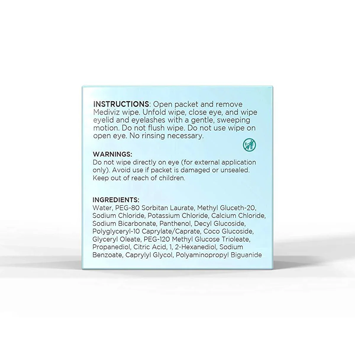 Open packet and remove MediViz wipe. Unfold wipe, close eye, and wipe eyelid and eyelashes with a gentle, sweeping motion. Do not flush wipe. Do not use wipe on an open eye. No rinsing necessary.